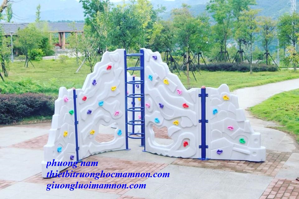 – Chất liệu: Nhựa LLDPE nhập khẩu an toàn cho bé khi sử dụng. Trên vách leo có khoét nhiều lỗ và gắn các mẫu nhựa để bám và leo núi.